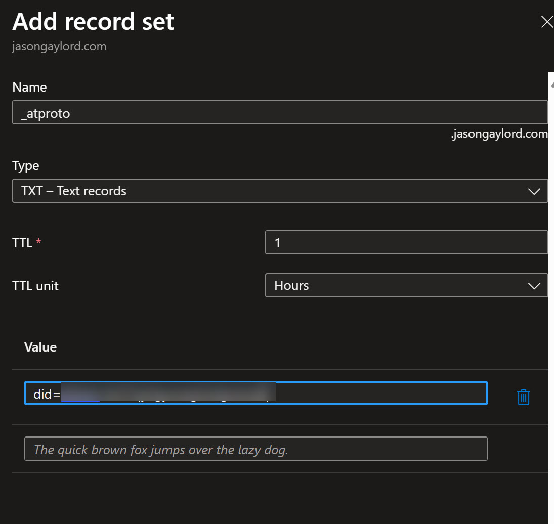Once you get those values, you’ll need to update your DNS for your custom domain. This can be done using the portal you use to manage your domain. For example, if you have your domain registered with GoDaddy and use their services for web hosting, you would need to modify the DNS at GoDaddy. In my case, I use Microsoft Azure so I navigated to my DNS and choose to add a new record like so:
