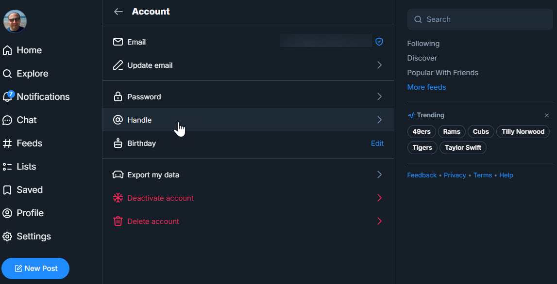 So, let’s first open up either the Bluesky app on our mobile device or navigate to the https://jasong.us/46DpagE. Once there, go to Settings > Account > Handle.