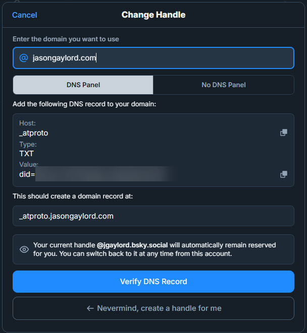 . But, there’s nothing there to indicate that I’m who I say I am. Anyone can create a new Bluesky account and say they’re me. That is, unless I go with the free* custom domain option. I say free, with an asterisk, because I either (a) already need to have a domain or (b) be willing to purchase a domain from Bluesky. In my case, I already owned JasonGaylord.com, so I plan on just using that.